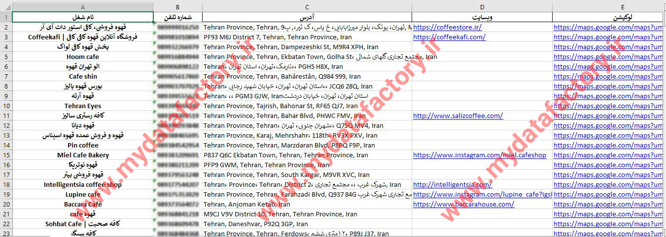 فیلد های بانک اطلاعاتی: نام کسب و کار شماره موبایل و تلفن ثابت وبسایت و شبکه های اجتماعی آدرس دقیق کسب و کار